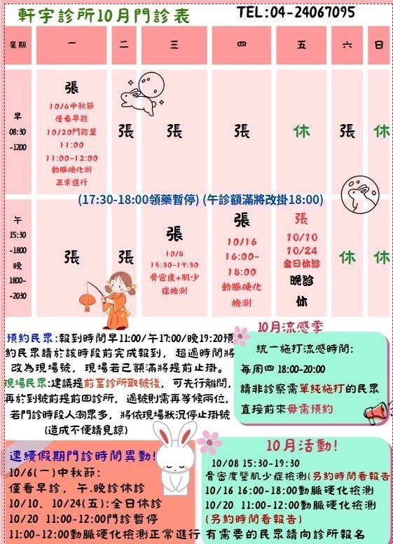 - 10/6:中秋節 → 僅上午看診,午晚診休診